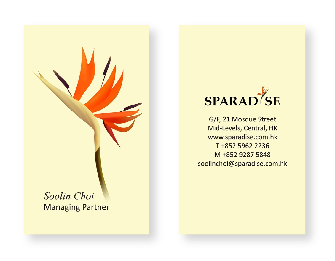 Sparadise A business card for Sparadise, with a bird of paradise illustration. Date: June 2013 Client: Sparadise Role: URL: www.sparadise.com.hk/ Tags: branding, business card, illustration